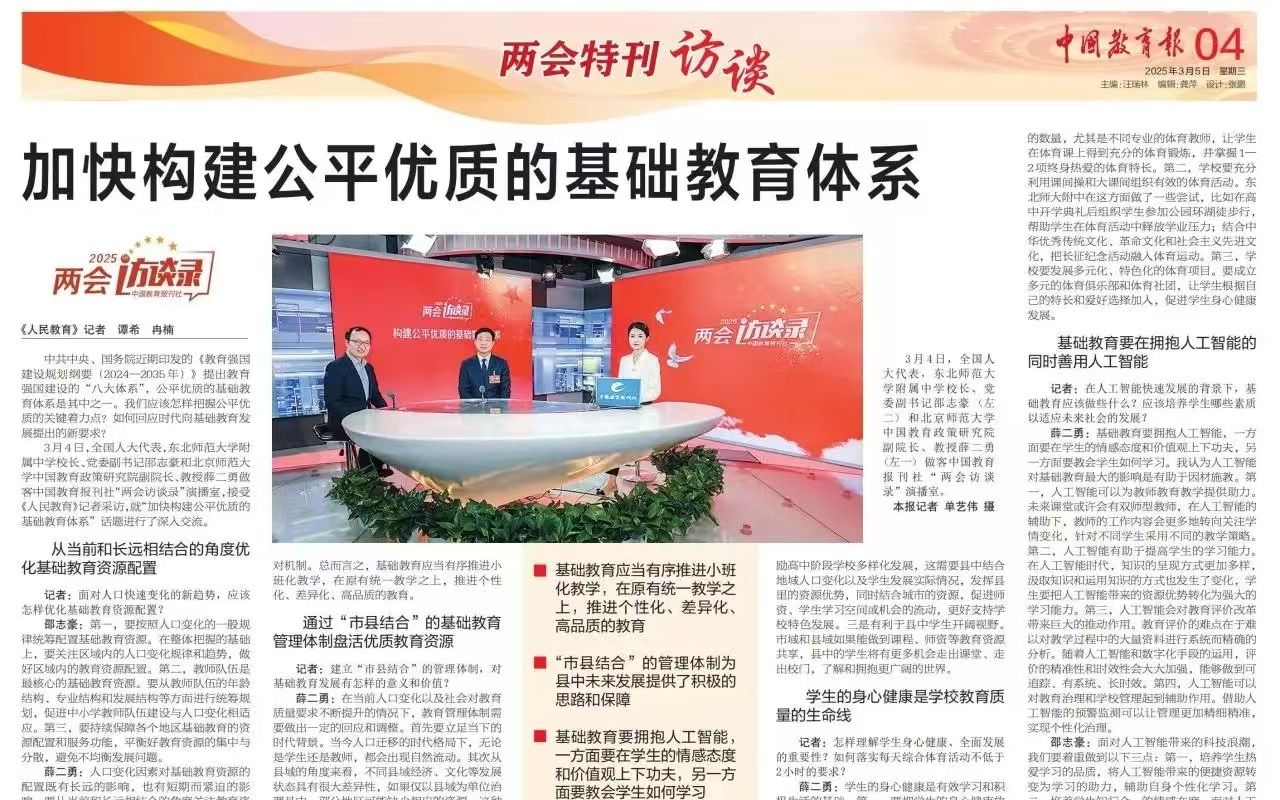 2月26日,中国教育电视台以“解码县域高中的‘强师密码’”为题,对全国人大代表,我校校长助理、附属中学校长邵志豪赴德惠市实验中学开展调研进行了宣传报道。报道中提到,此次调研围绕深入学习贯彻《教育强国建设规划纲要(2024-2035年)》,就建设高素质专业化教师队伍、筑牢教育强国根基进行了深入探讨。附:报道链接